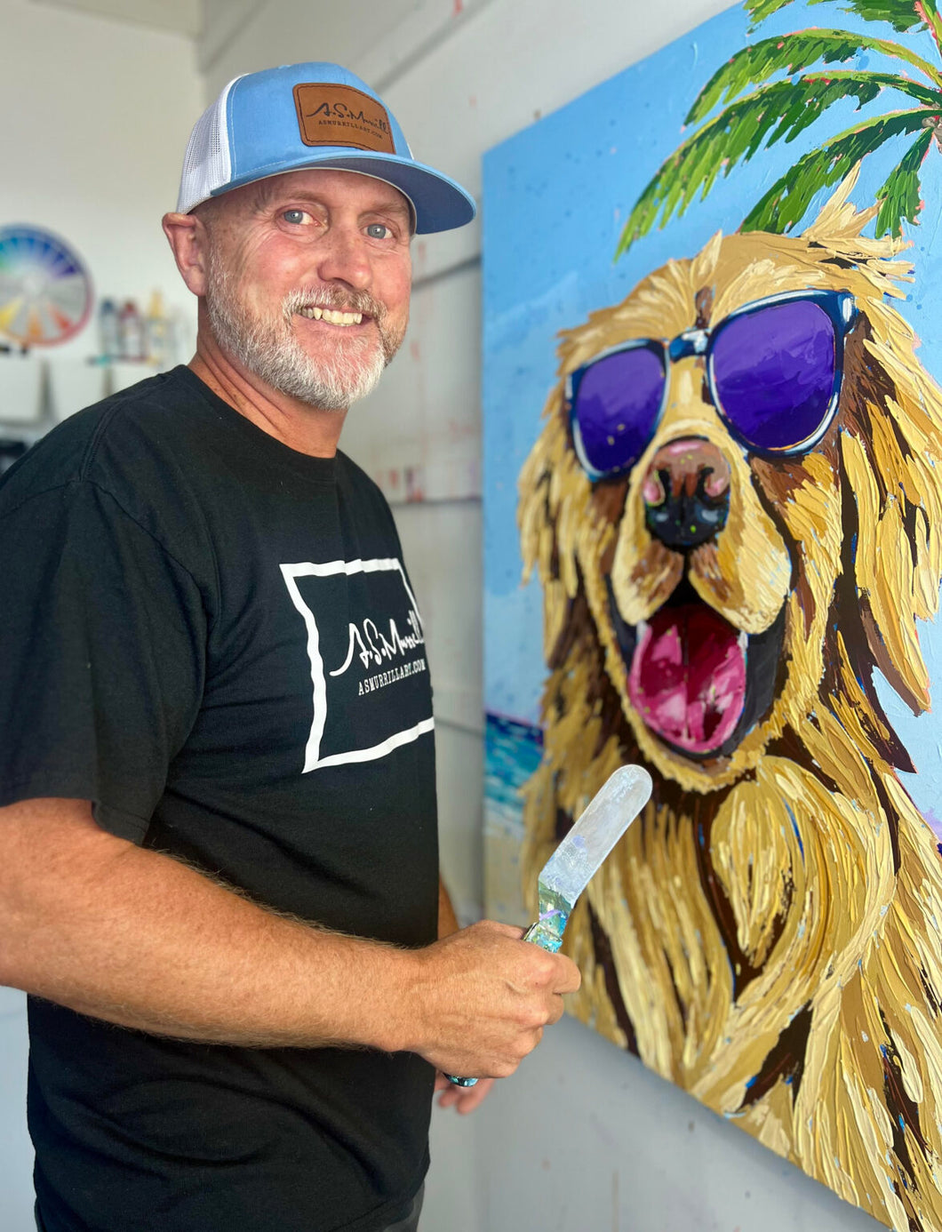 Working primarily with heavy body acrylics and palette knives, Anthony creates bold, textured canvases that celebrate color, movement, and character. His subjects range from whimsical animals and florals to coastal and mountain landscapes, each piece infused with his signature combination of complementary underpainting, sculpted layers, and playful splatters.